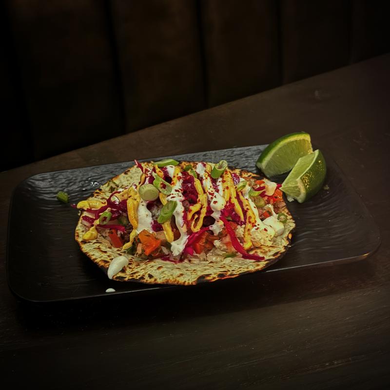 coconut panko fried shrimp, sweet chili glaze, pineapple salsa, house slaw, sriracha mayo, lime crema, scallions