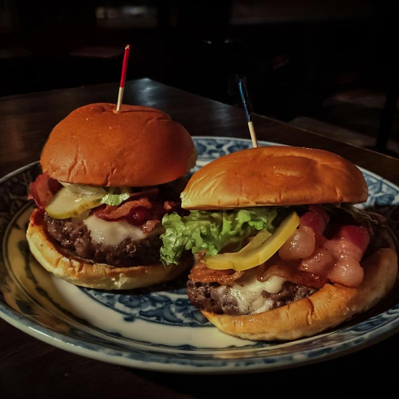 two beef sliders, bacon, cheese, lettuce, tomato, pickles, onions, curry ketchup