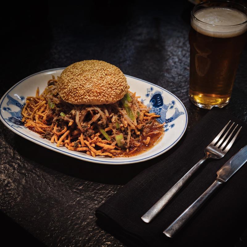 sesame seed bun, chow mein gravy, ground beef or chicken, onion, celery, sprouts, Oriental Chinese Noodle Co. chow mein noodles