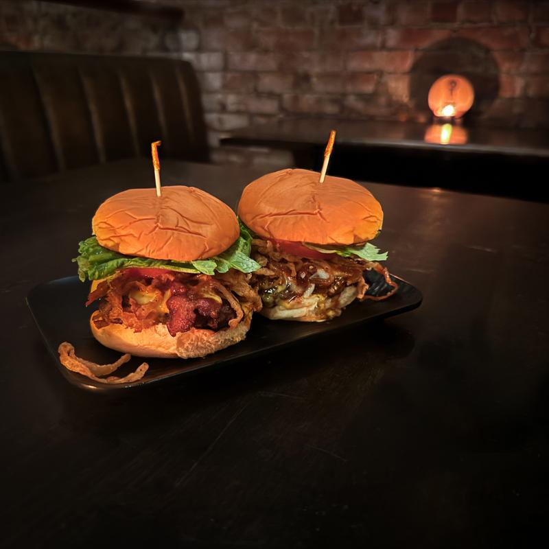 two beef sliders, house BBQ, honey mustard, bacon, cheese, lettuce, tomato, fried onions